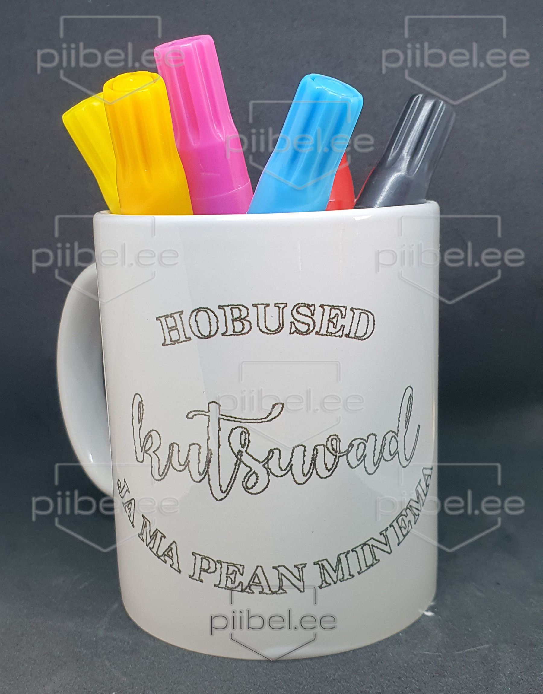 Valge 330ml kruus millel on peal kujutuis, Pliiatsitega saab ise pilti värvida. Pliiatsid tulevad sooja veega peastes maha külma veega pestes ei tule.