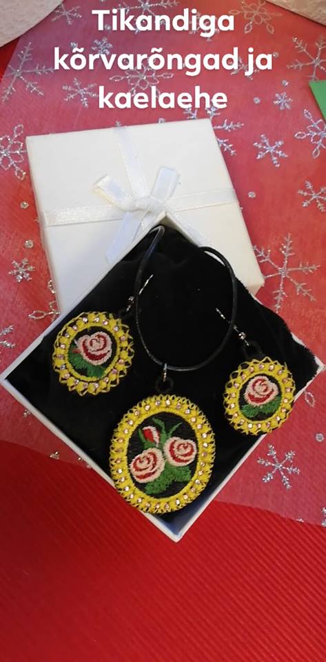 Masintikandis medaljon roos ja samas stiilis kõrvarõngad. Kaunistuseks on lisatud väikesed helkivad kivikesed.